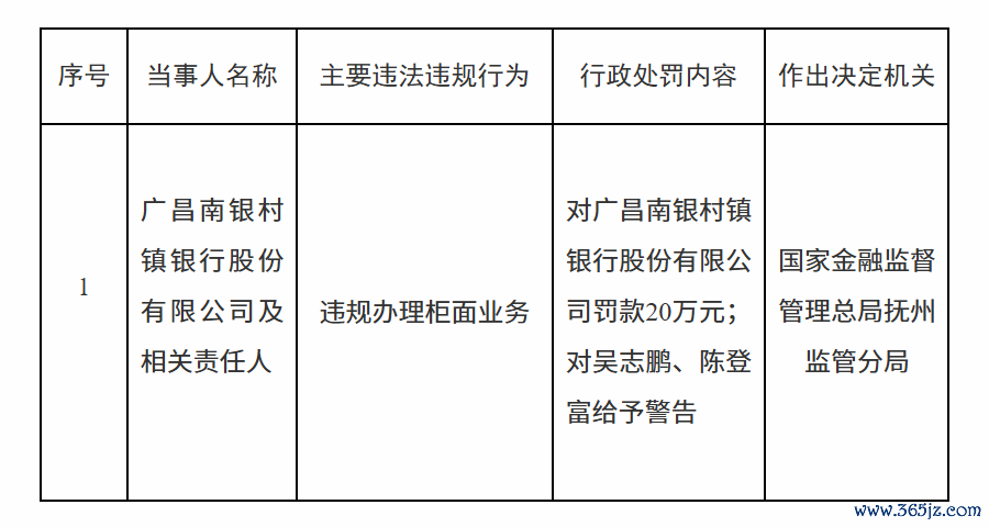 1月21日盛盈优配,国家金融监督管理总局抚州监管分局行政处罚信息公开表显示,广昌南银村镇银行股份有限公司因违规办理柜面业务被罚款20万元;责任人吴某鹏、陈某富被给予警告。